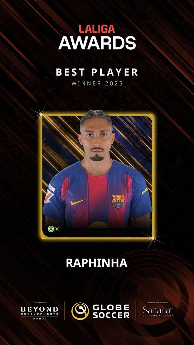 | 北京时间12月28日,2025年度环球足球奖颁奖典礼在迪拜举行,其中,拉菲尼亚获得了2025年度最佳西甲球员奖。