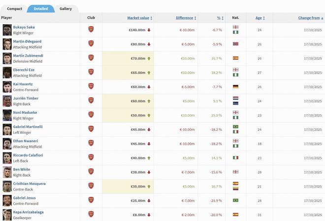 | 北京时间10月17日,德转更新了英超球员身价,阿森纳身价变动球员如下。