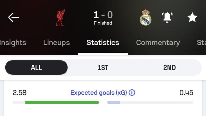 | 北京时间11月5日,在欧洲冠军联赛阶段第4轮的对决中,利物浦以1-0战胜皇家马德里。赛后,知名统计机构Sofascore Football给出了皇马的预期进球,皇马最近四年欧冠对阵英超球队预期进球都是最低的。