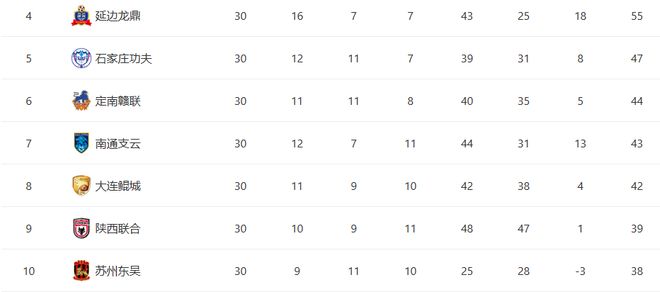 最后让我们再来看一下本赛季中甲最终的积分榜情况。